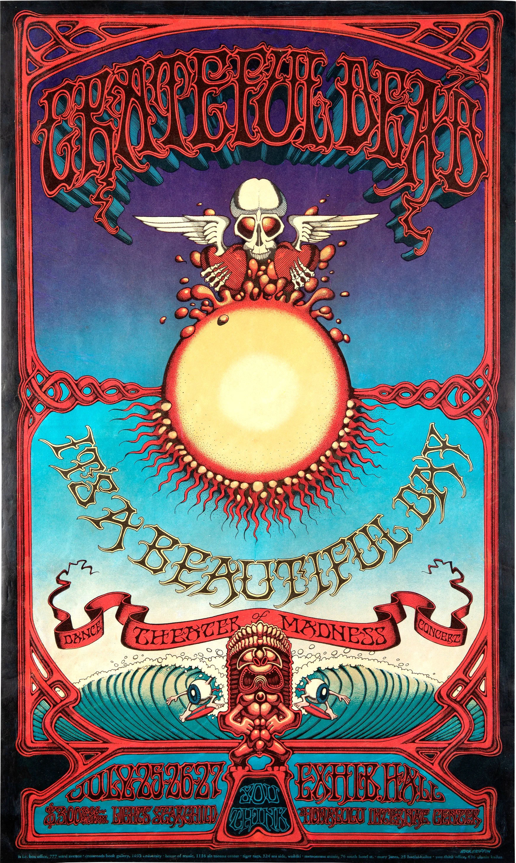 Les références aux cultures anciennes se multiplient et se mélangent. Sur l’affiche du concert, les couleurs sont reprises : noir pour le fond, rouge pour le cadre, dégradé de bleu pour le fond du dessin. Cependant le cadre, élément décoratif fait d’entrelacs d’inspiration celte, prend une place centrale dans la composition. Il vient l’entourer et la scinde en deux. Dans la partie supérieure, on retrouve la même typographie “Grateful Dead” ainsi qu’un crâne squelette ailé tenant non plus des œufs mais des cœurs. Le soleil est maintenant au centre de l’image et est partagé entre traitement amérindien et éclaboussures. Dans la partie inférieure apparaissent le nom de l’événement séparé entre un texte libre et un cartel stylisé en rouleau sur un piédestal rappelant les bas-reliefs maya ou inca. De chaque côté, en dessous du rouleau, se déploie une vague sur laquelle surfe un œil. Le traitement de cette vague n’est pas sans rappeler celles des estampes japonaises tandis que la typographie au bas du cadre semble un mélange d’inspirations celte et amérindienne. Ce grand amalgame d’influences et de styles variés est uni par le traitement de la couleur et des formes.