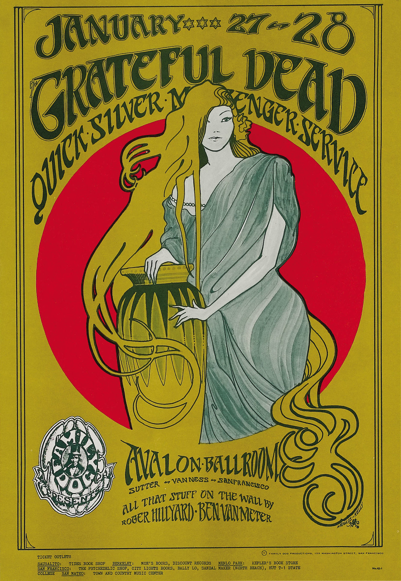 Stanley “Mouse” George Miller a travaillé avec Gratefull Dead dans le début des années 60 et un peu après 1970. Via Mouse Studios et Monster Company, il publie en collaboration avec Aston Kelley, des affiches et pochettes d’albums. Il signe leurs premières affiches de concert avant même la parution de leur premier album en 1967. La plus emblématique est celle du concert des 16 et 17 septembre 1966 à l’Avalon Ballroom de San Francisco. On retrouve alors déjà la symétrie, les déformations organiques des typographies, la place des décorations qui encadrent l’image. De même le squelette est lui aussi central. Sur une affiche moins connue de 1967, toujours pour un concert à l’Avalon, Stanley Mouse affirme l’influence d’Alfons Mucha et de l’art nouveau sur sa pratique. Le cadrage décoratif, la place centrale du personnage et l’utilisation de la lithographie comme médium l’inscrivent dans cette lignée.