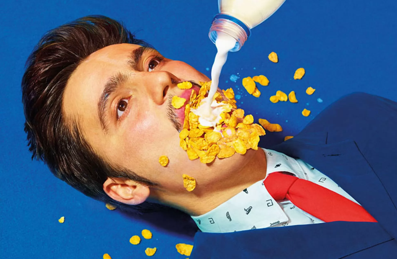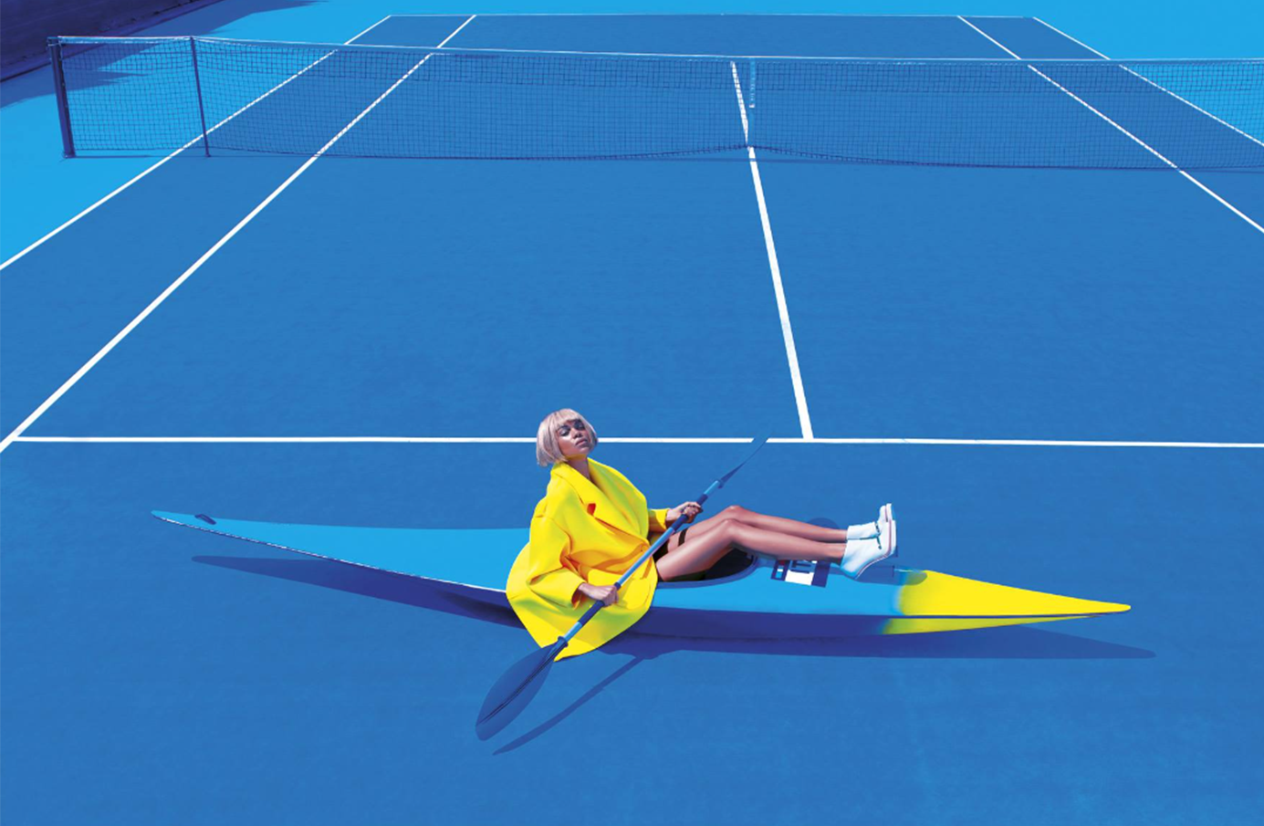L’artiste Maurizio Cattelan et le photographe publicitaire Pierpaolo Ferrari fondent le magazine Toilet Paper en 2010 et le placent sous la direction artistique de Micol Talso. Dans cette édition se rencontrent les visions sulfureuses et provocatrices de M. Cattelan et l’œil aiguisé de P. Ferrari pour créer une imagerie surréaliste. La mise en scène et le cadrage réglé au millimètre nous emmènent dans une narration contre-intuitive dans les relations entre objets et sujets, qui sont le cœur de ces images. Sur une des page de neuvième numéro paru en février 2017, on voit le visage d’un homme en costume bleu, dans la bouche duquel on verse des céréales et du lait. Le sujet (à comprendre la personne) devient un objet au sein de la composition. Dans le numéro onze qui paraît en juin 2015, on peut voir une femme en jaune dans un kayak jaune et bleu sur un terrain de tennis bleu. Cette fois c’est le sens qui s’échappe puisque le canoë n’est pas sur l’eau mais sur la terre ferme. Ces photographies nous font entrer dans un univers surréaliste dont les couleurs chatoyantes rappellent l’esthétique de la publicité des années 1970-80. La palette saturée est souvent présente sous forme d’aplat ou grâce à des vêtements monochromes. C’est par exemple le cas sur la couverture du numéro 17 publié en avril 2019 où l’on retrouve du vert, du rose, du bleu et du rouge grâce aux shorts.