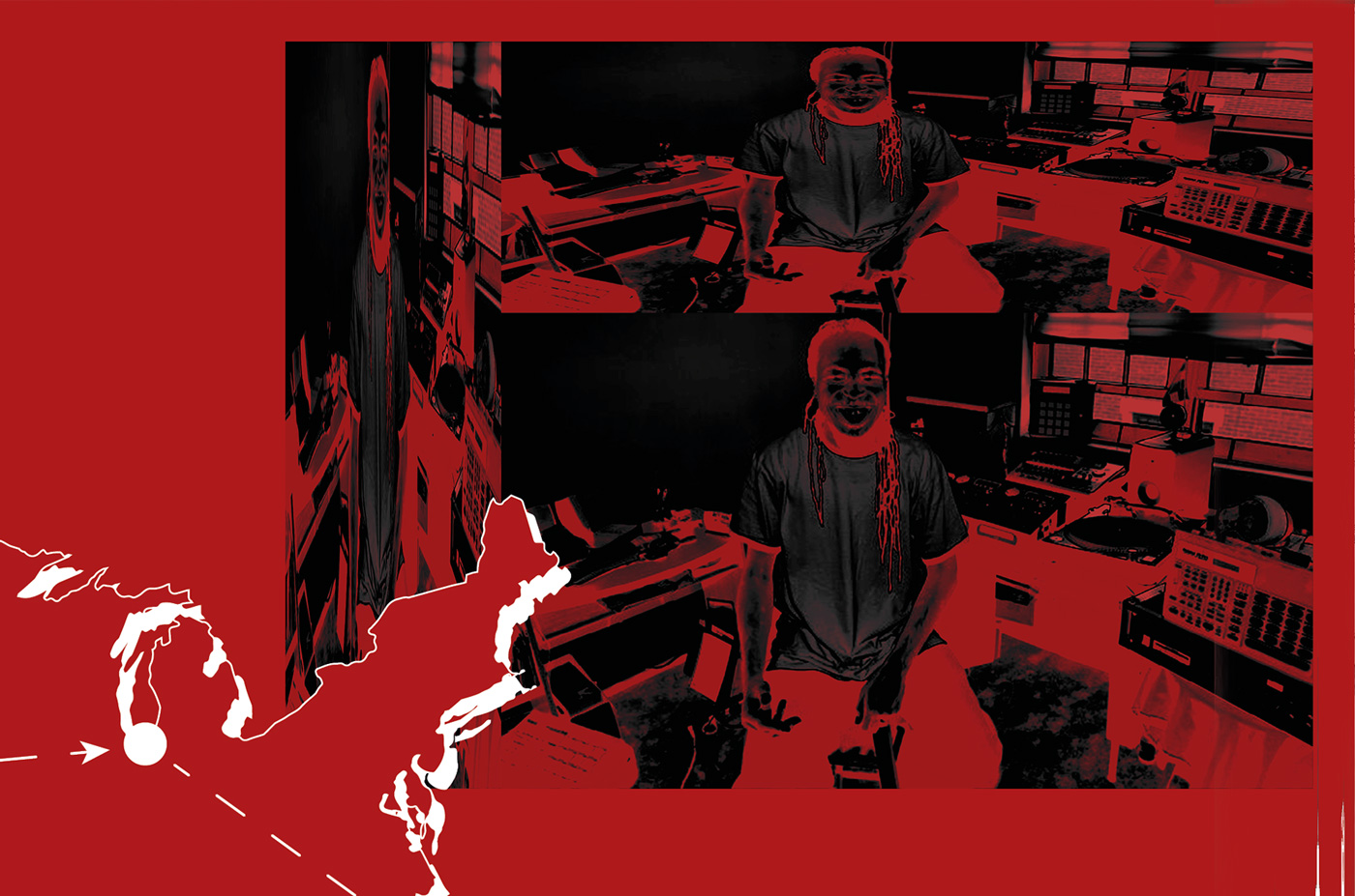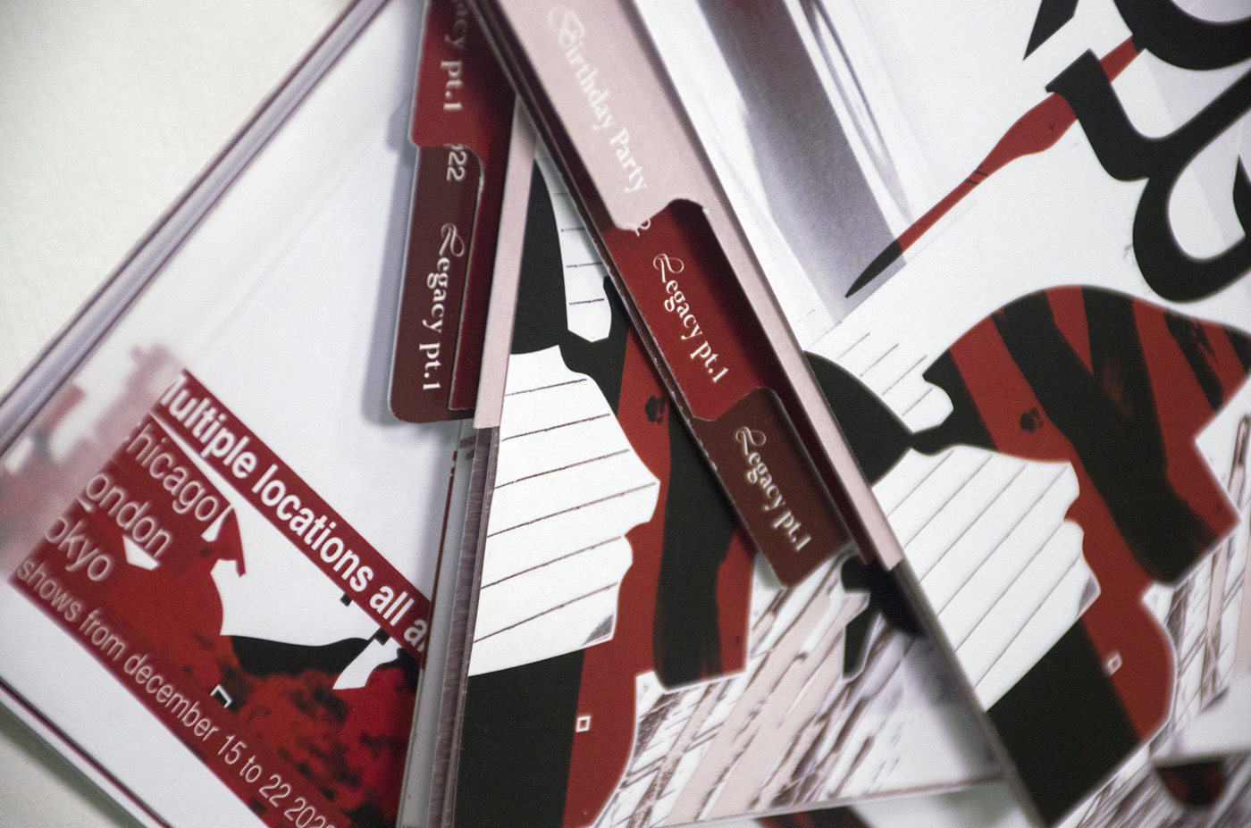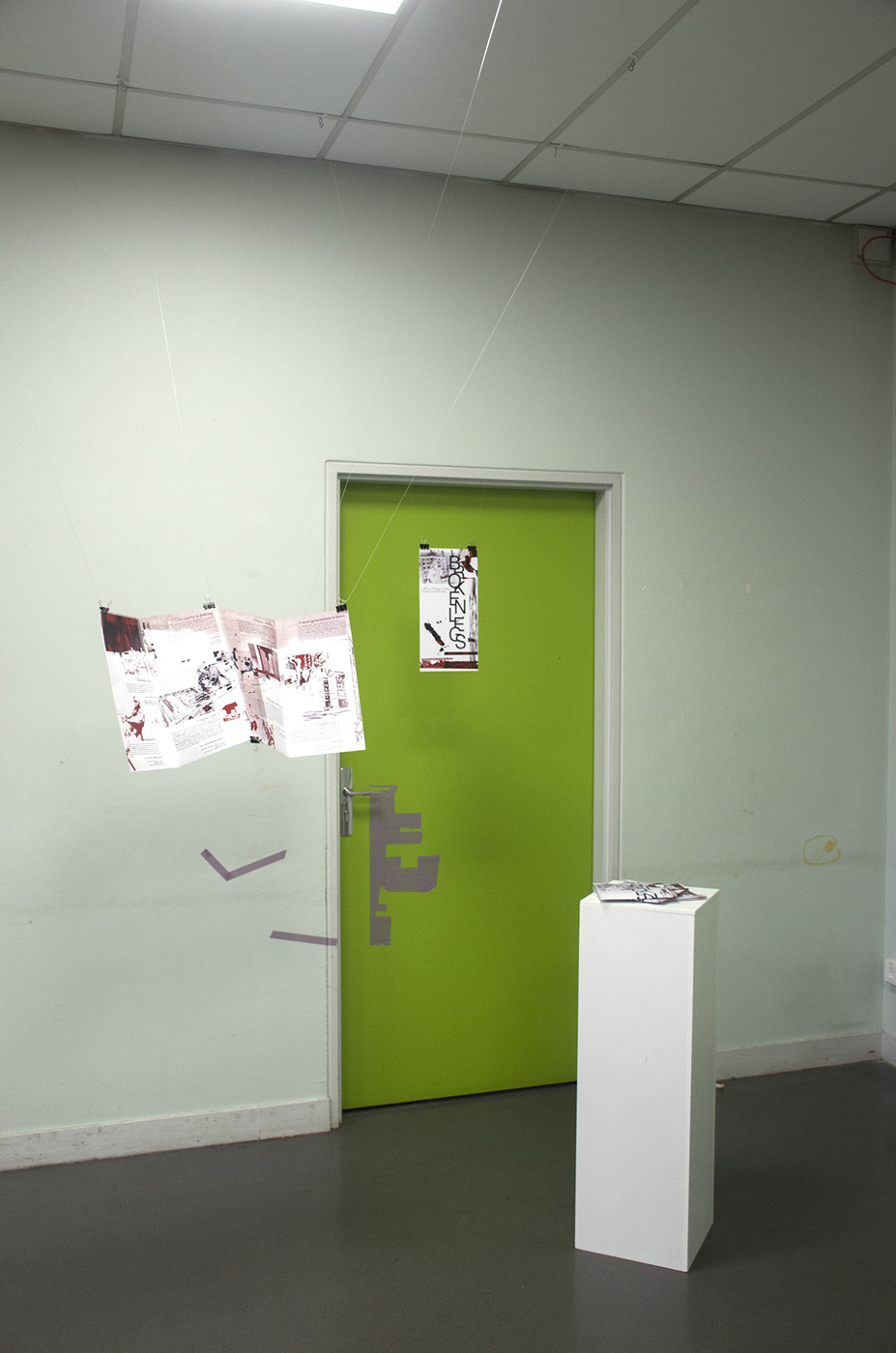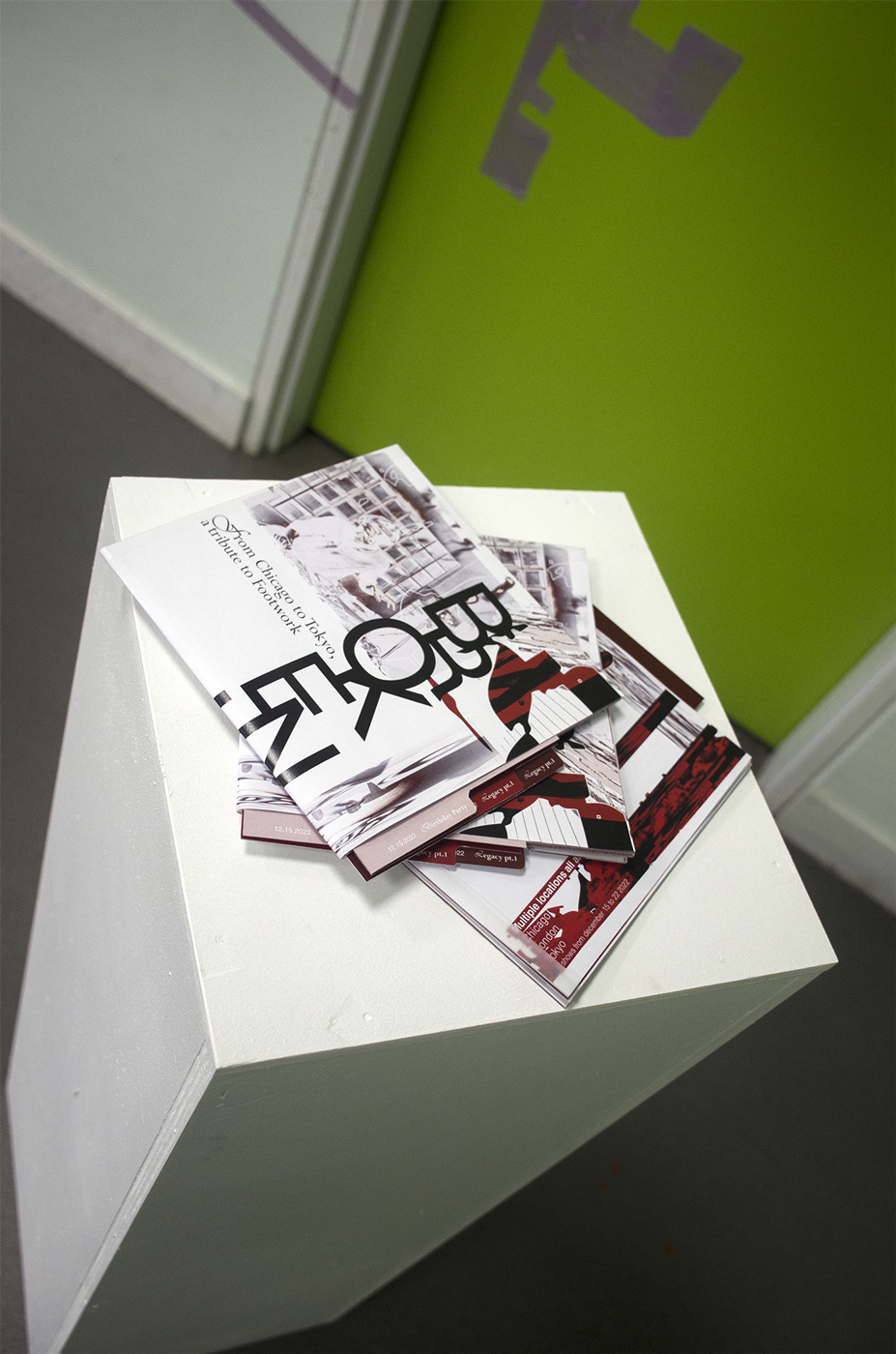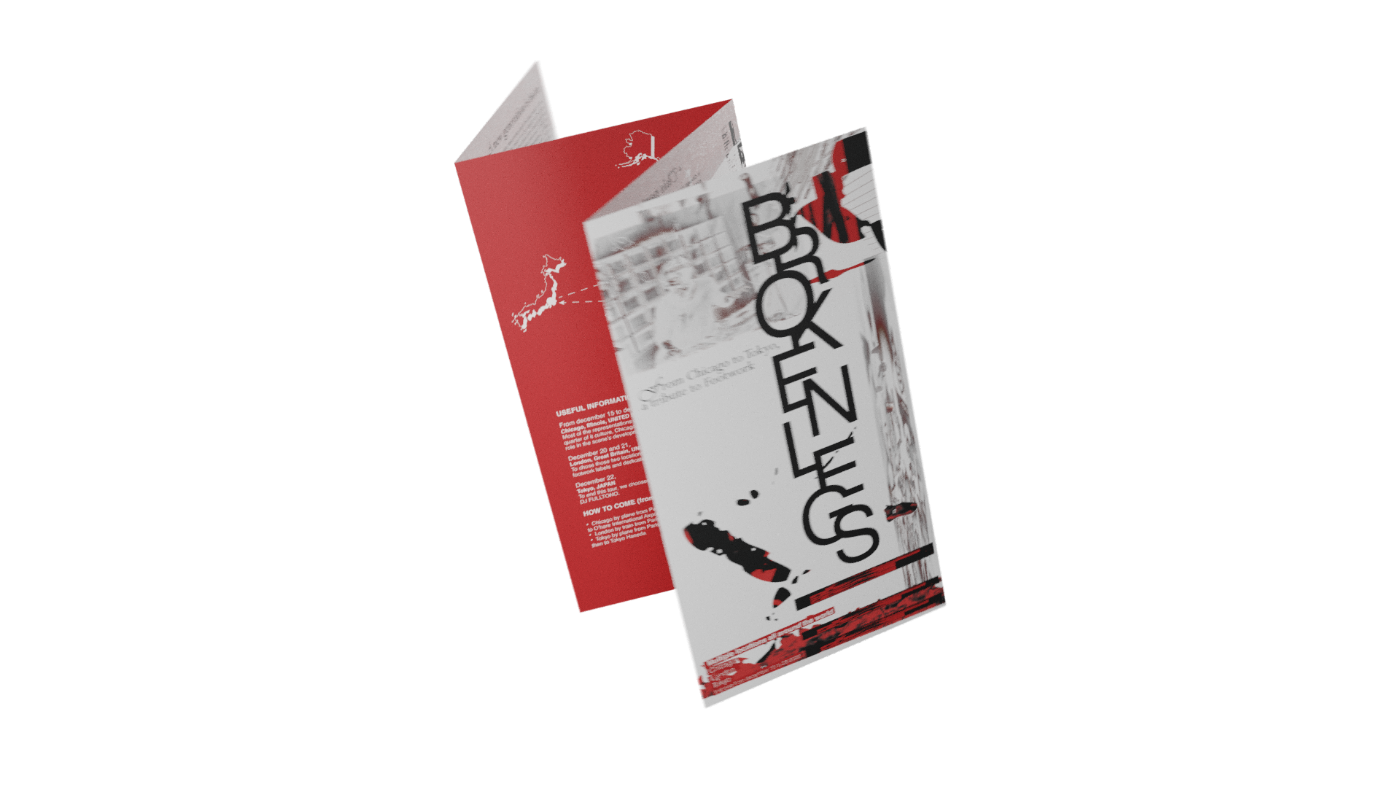Programme d’un festival de danse fictif, Broken Legs. Travail de recherche autour du footwork, élaboration d’un dépliant et flyers de spectacle. Le footwork est un style musical et une danse jouant sur une rythmique saccadée, des samples repétés, déformés, un jeu de jambes effrené. L’identité graphique du dépliant reprend ces concepts en les appliquant à l’image et au texte.