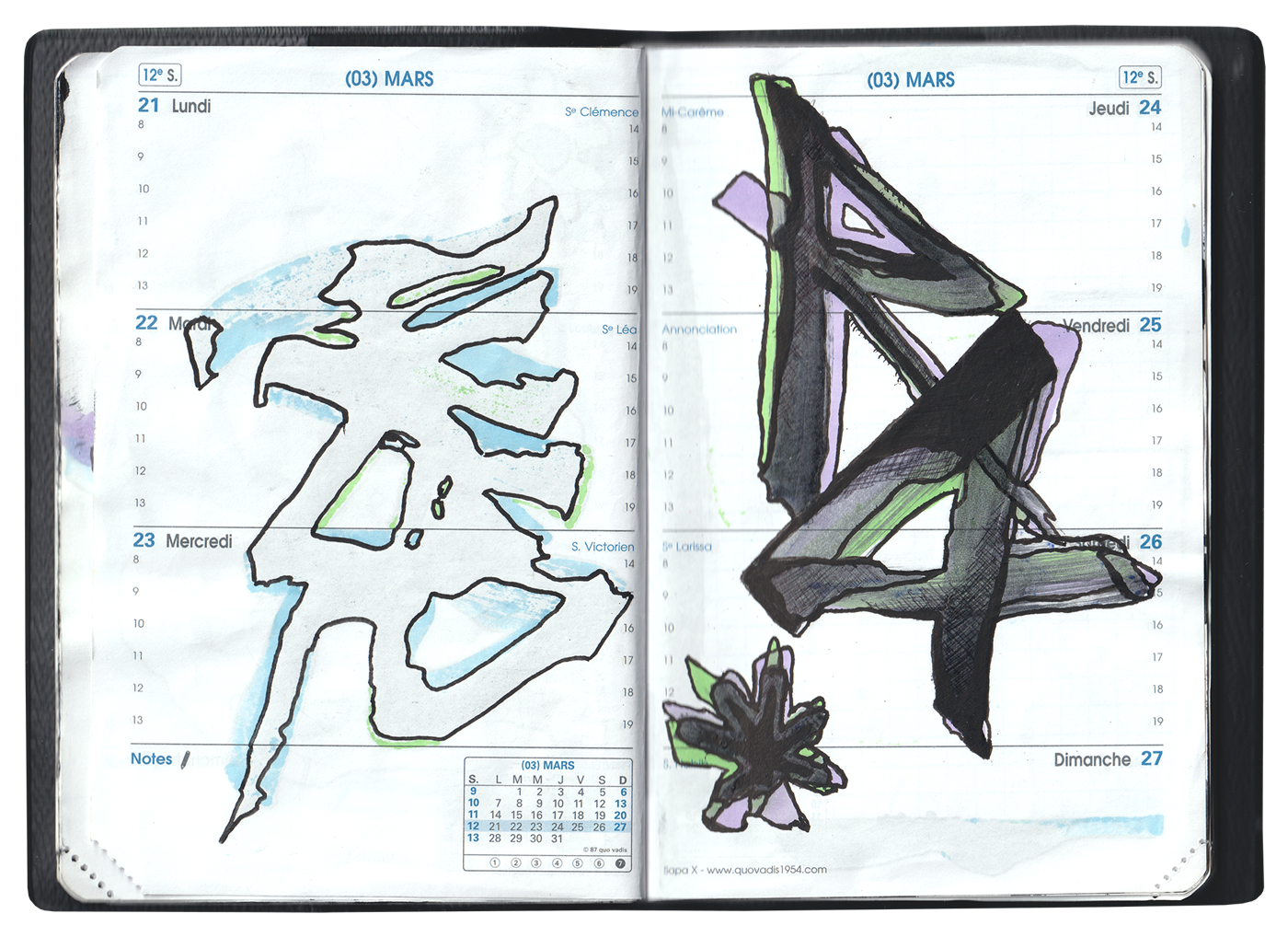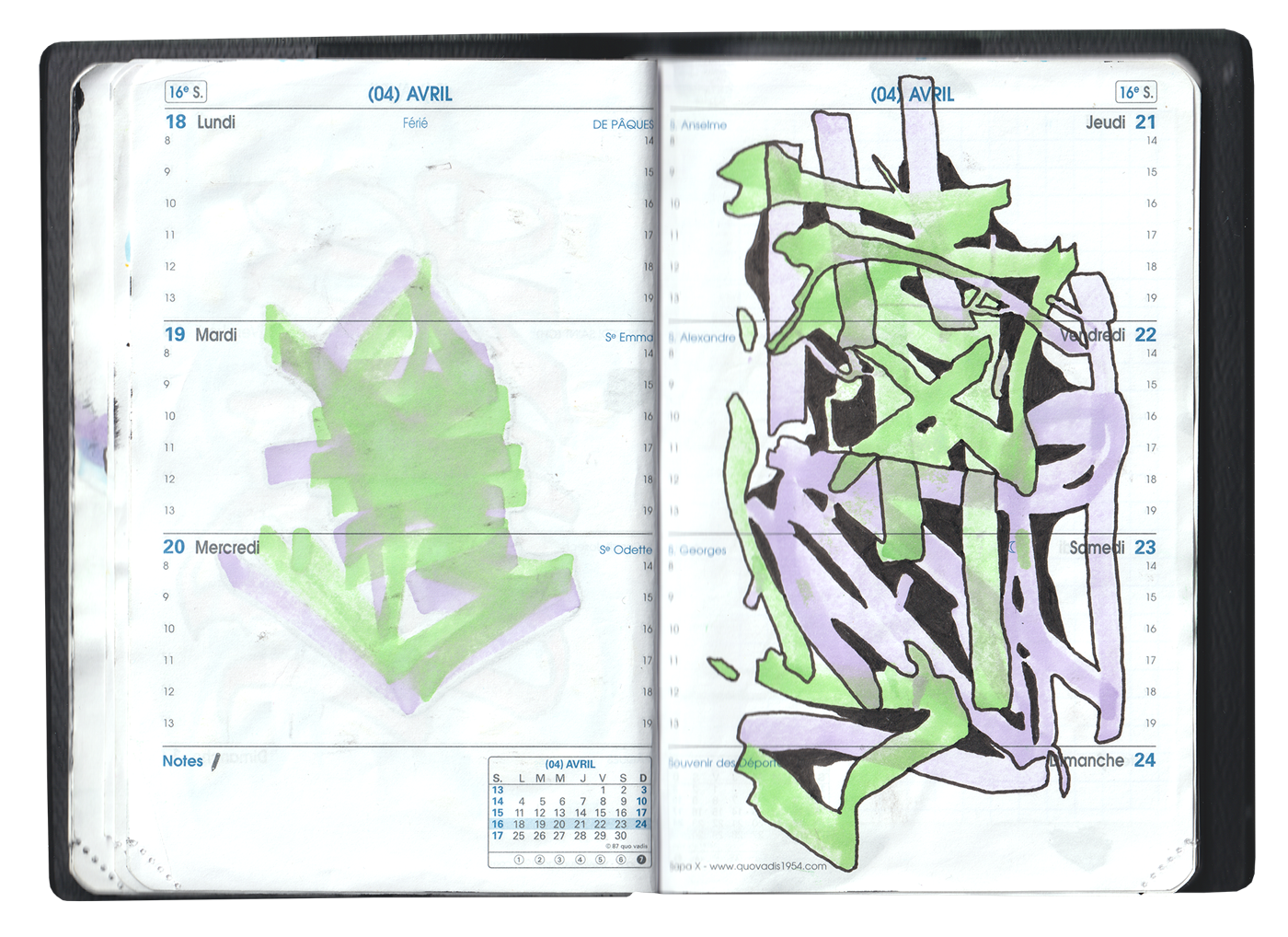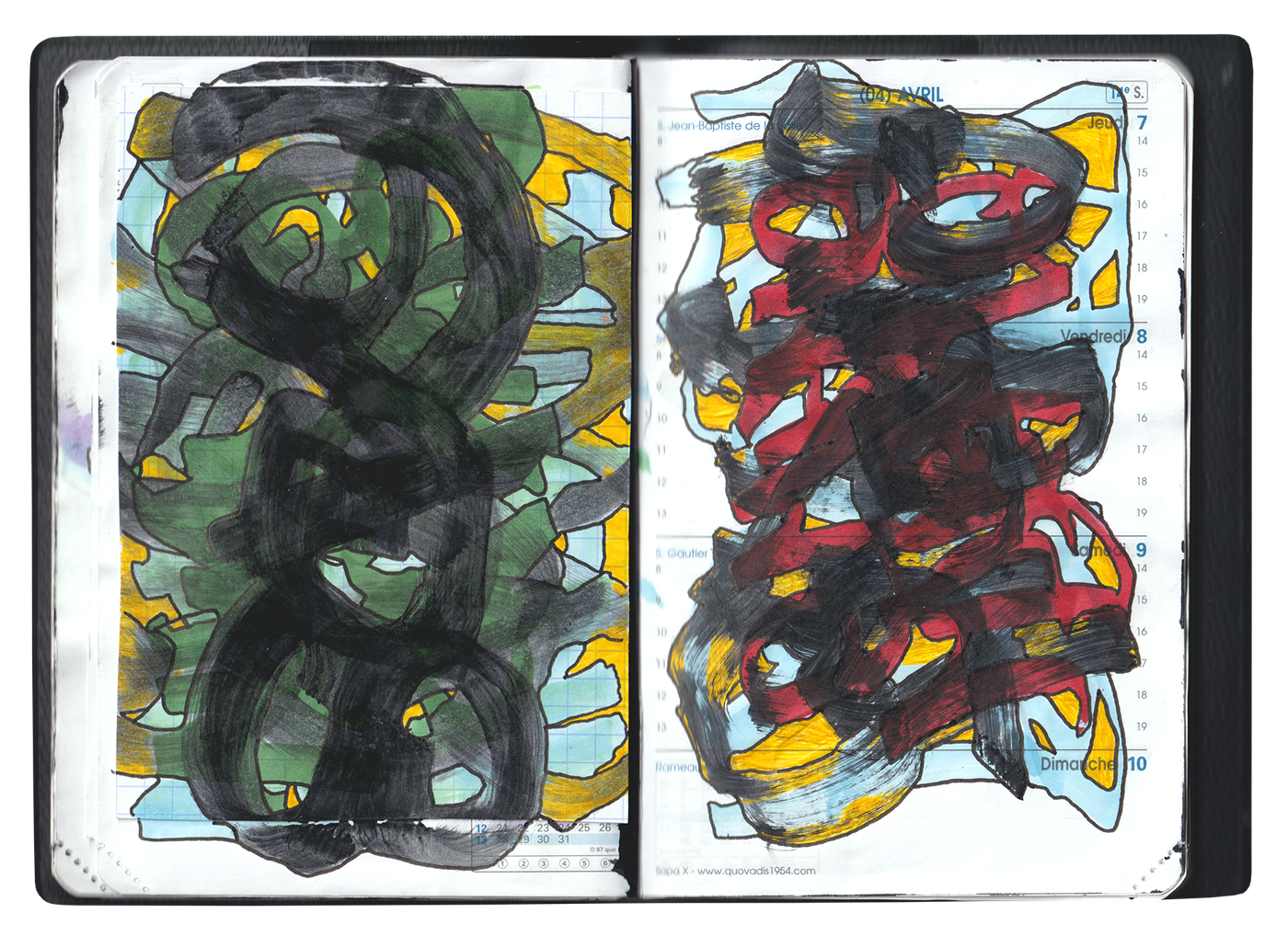 Travail autour de la forme et de la contre-forme, du visible et de l’invisible, du lisisble et de l’illisible. La trace laissée par le geste importe plus que le sens. Les signes sont utilisés comme participants d’une composition générale.